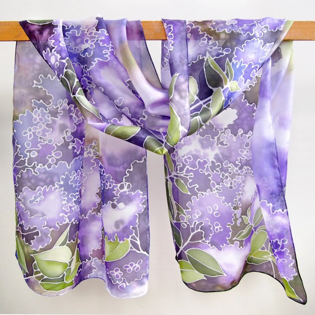 Here we have the gorgeous Hermès’ Dans un Jardin Anglais and the Tulipomanie gavroche again and a more inexpensive silk scarf with a lovely pattern of lilacs. The latter was from seller on Etsy.