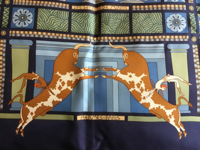 As I have continued to collect Hermès scarves over the last four years, I have realised that there are many designs which appeal to my interests and experiences in life. I have a BA and an MA in Ancient History and Archaeology and part of my studies included a fabulous trip around Italy and Greece, taking in many of the Greek islands. We visited the famous Minoan palace of Knossos on Crete and also other sites and museums, such as the famous Archaeological Museum in Heraklion. So, you can see my interest in this scarf design!