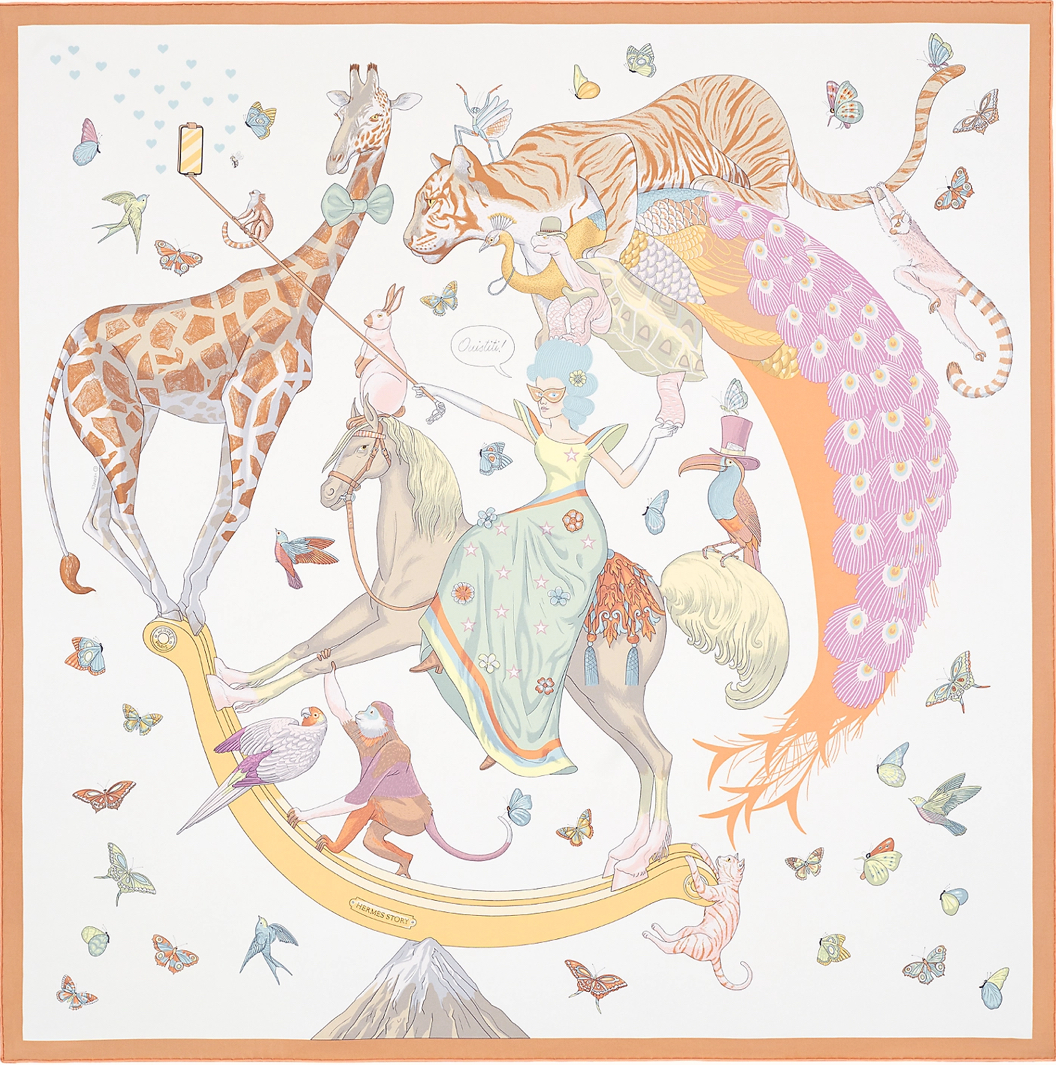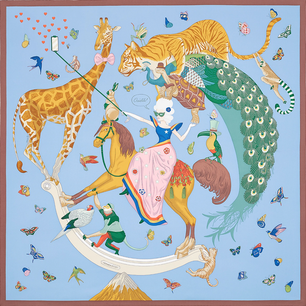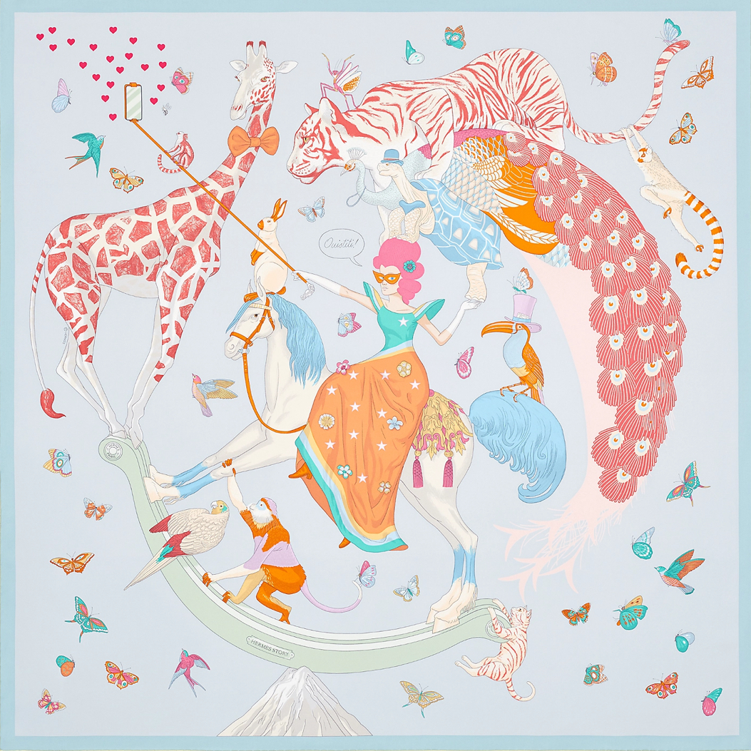 “British illustrator Jonathan Burton presents his second collaboration with the Maison with a design that pokes fun at our era, one where social media and self-presentation result in all kinds of means—sometimes dangerous—to impress. Perched on a snowy mountain top, an equestrian and her comrades pose like acrobats: if one of them stumbles, the whole pyramid collapses! Despite the somewhat unsteady performance, everyone is dressed to the nines and hopes to look their best. The giraffe dons a bow tie; the turtle and the pelican picked out their best hats for the occasion. The selfie is a success and the phone blows up with likes!”