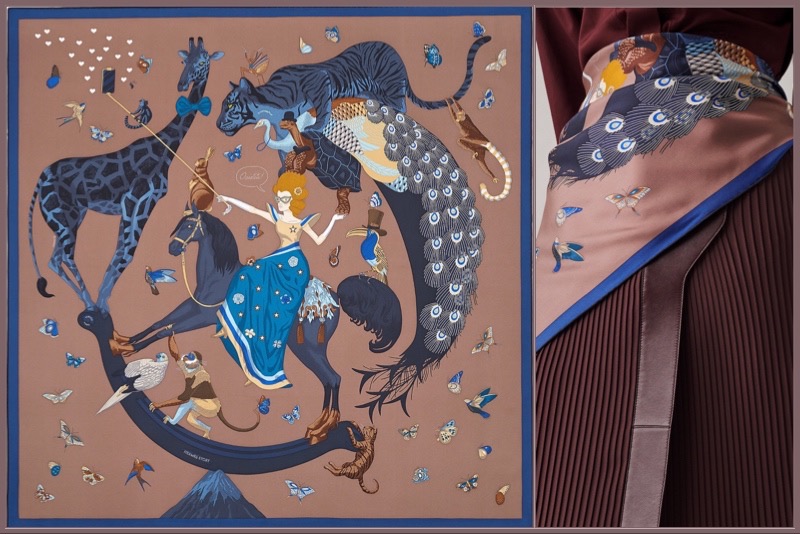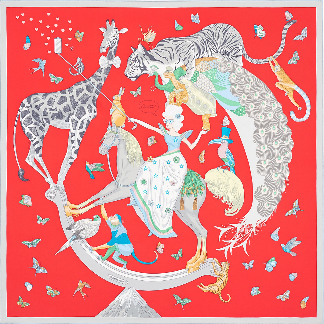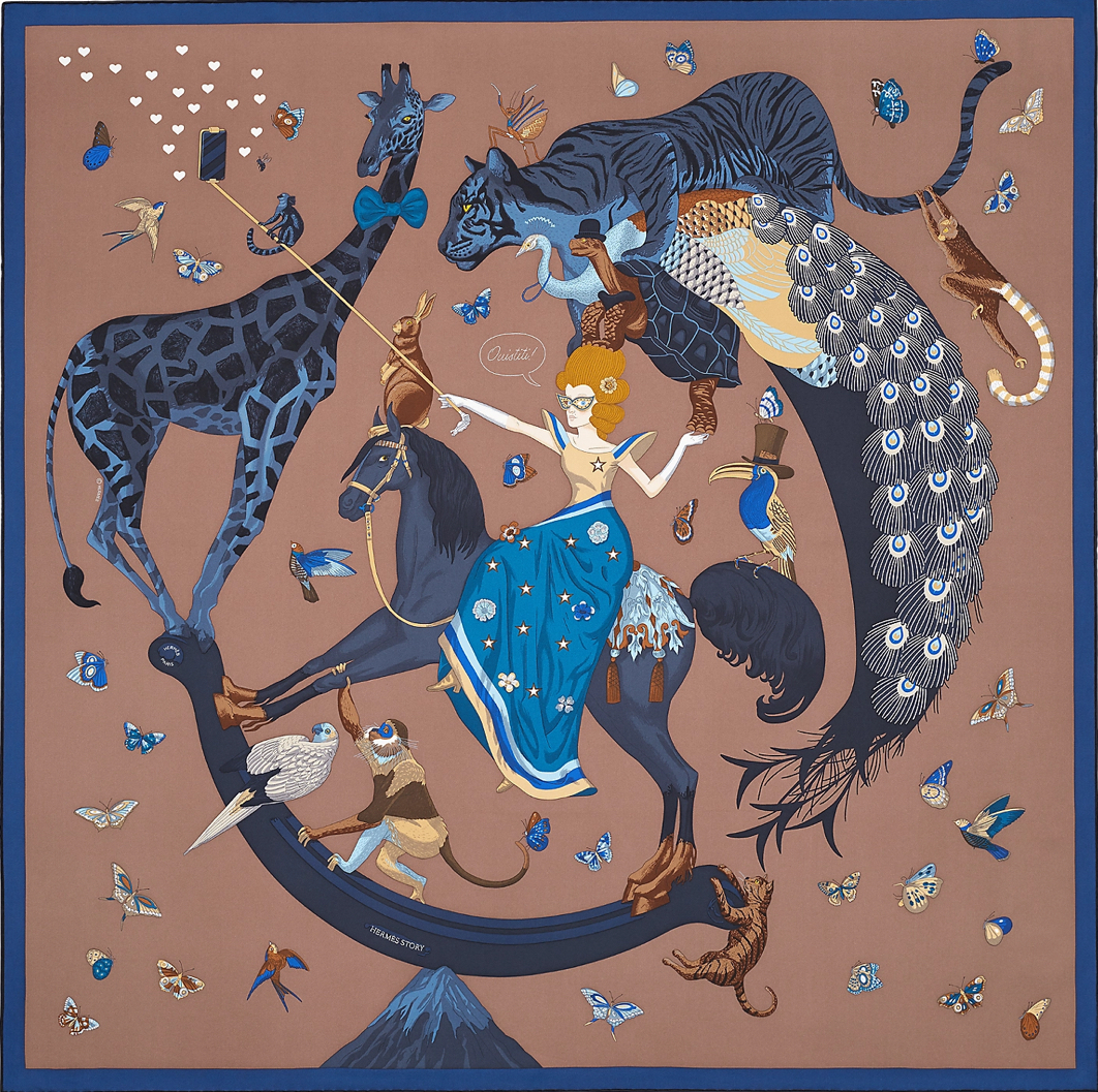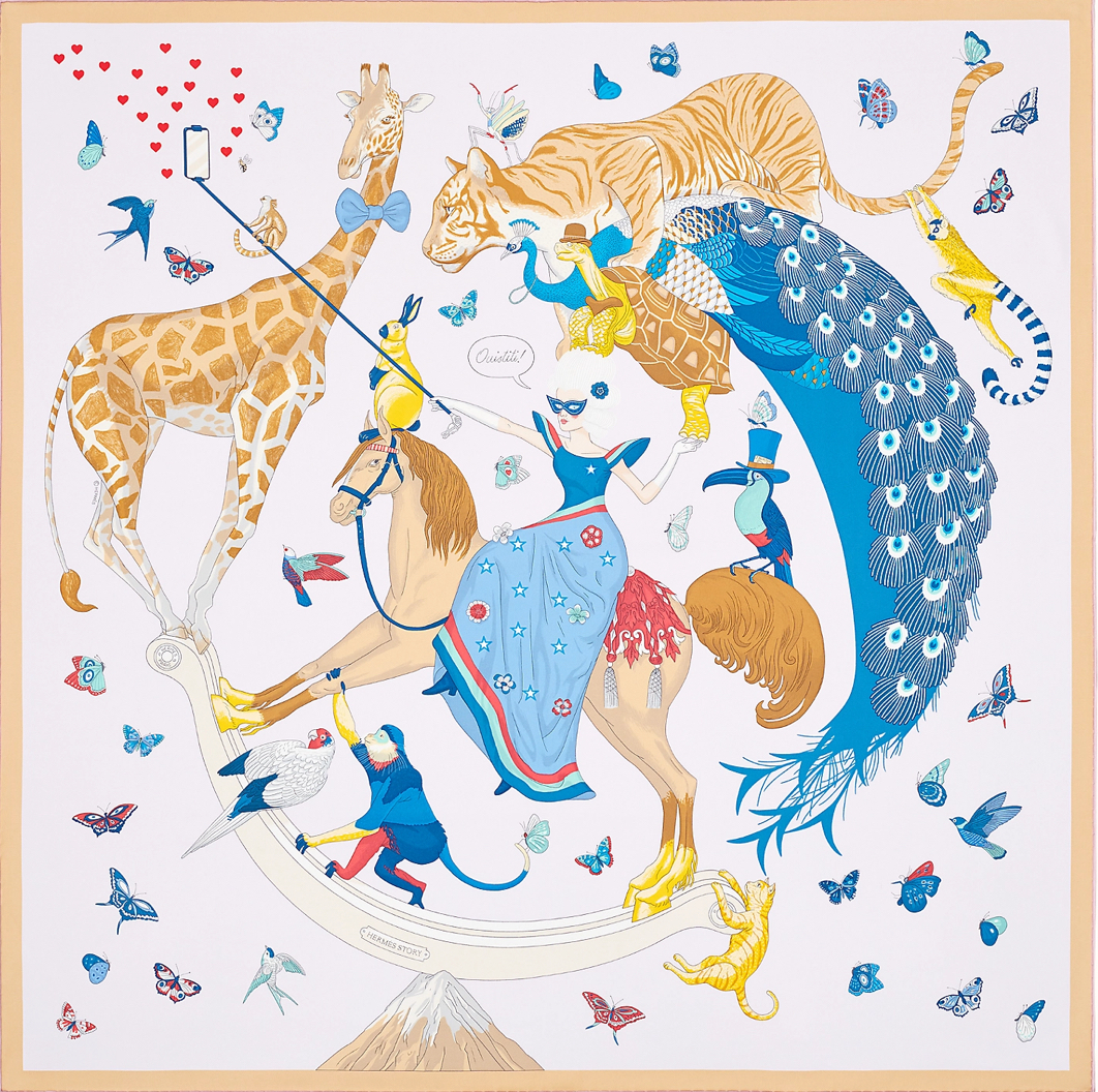 “British illustrator Jonathan Burton presents his second collaboration with the Maison with a design that pokes fun at our era, one where social media and self-presentation result in all kinds of means—sometimes dangerous—to impress. Perched on a snowy mountain top, an equestrian and her comrades pose like acrobats: if one of them stumbles, the whole pyramid collapses! Despite the somewhat unsteady performance, everyone is dressed to the nines and hopes to look their best. The giraffe dons a bow tie; the turtle and the pelican picked out their best hats for the occasion. The selfie is a success and the phone blows up with likes!”
