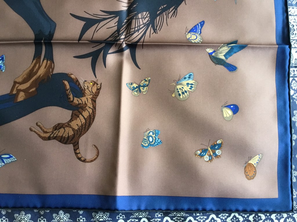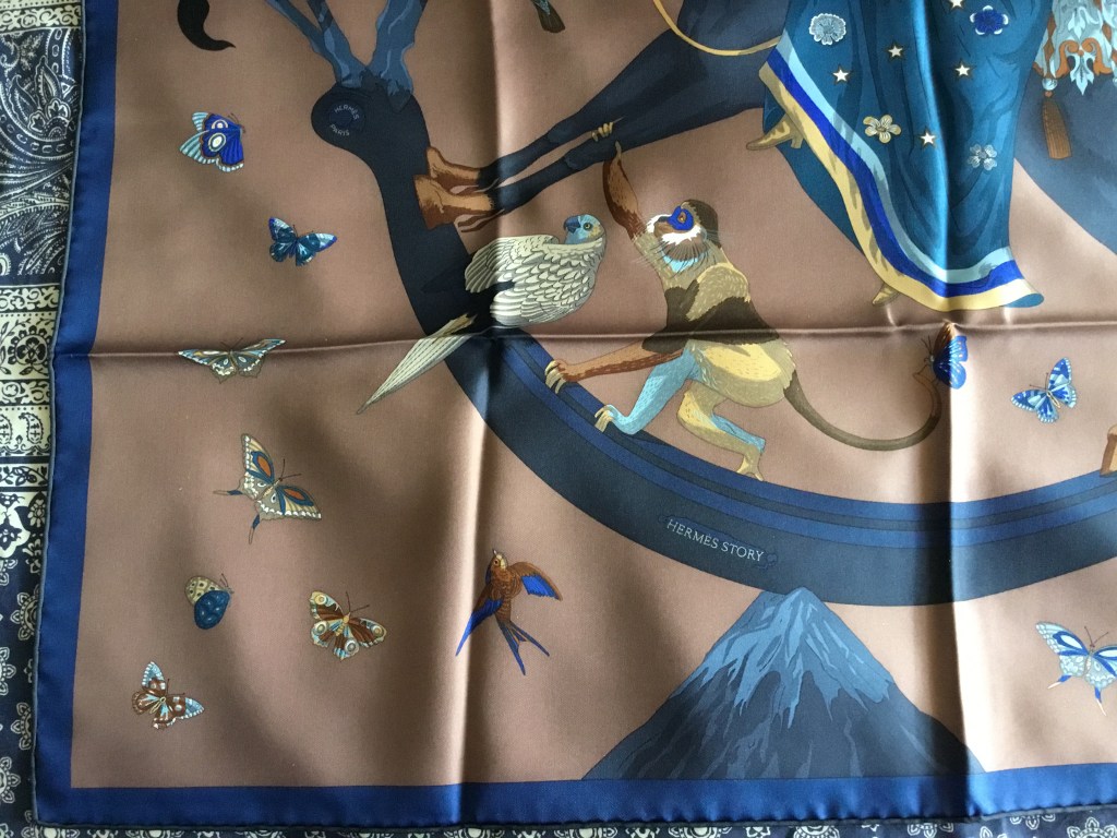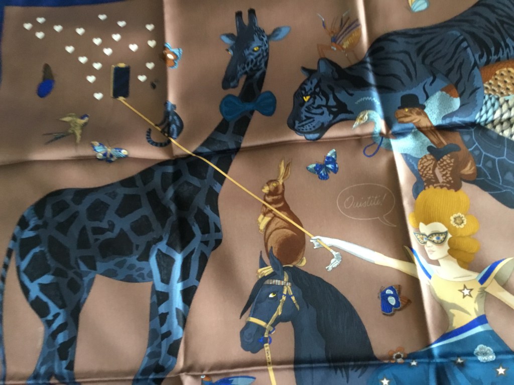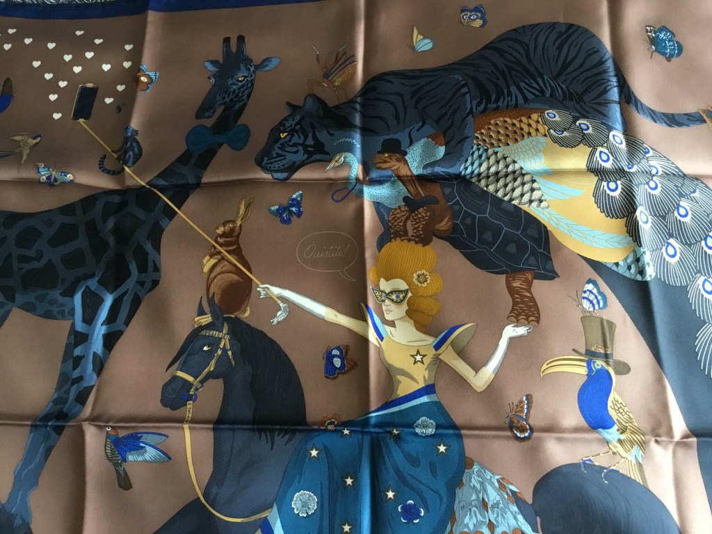 The image on the scarf is of an amusing scene. A beautiful woman and her motley group of followers pose for a selfie. They are surrounded by clouds of butterflies and birds. She rides a wooden steed, perched on a mountain top, and her companions are precariously balanced, one upon another, for the moment of the photograph. Will they collapse and fall?